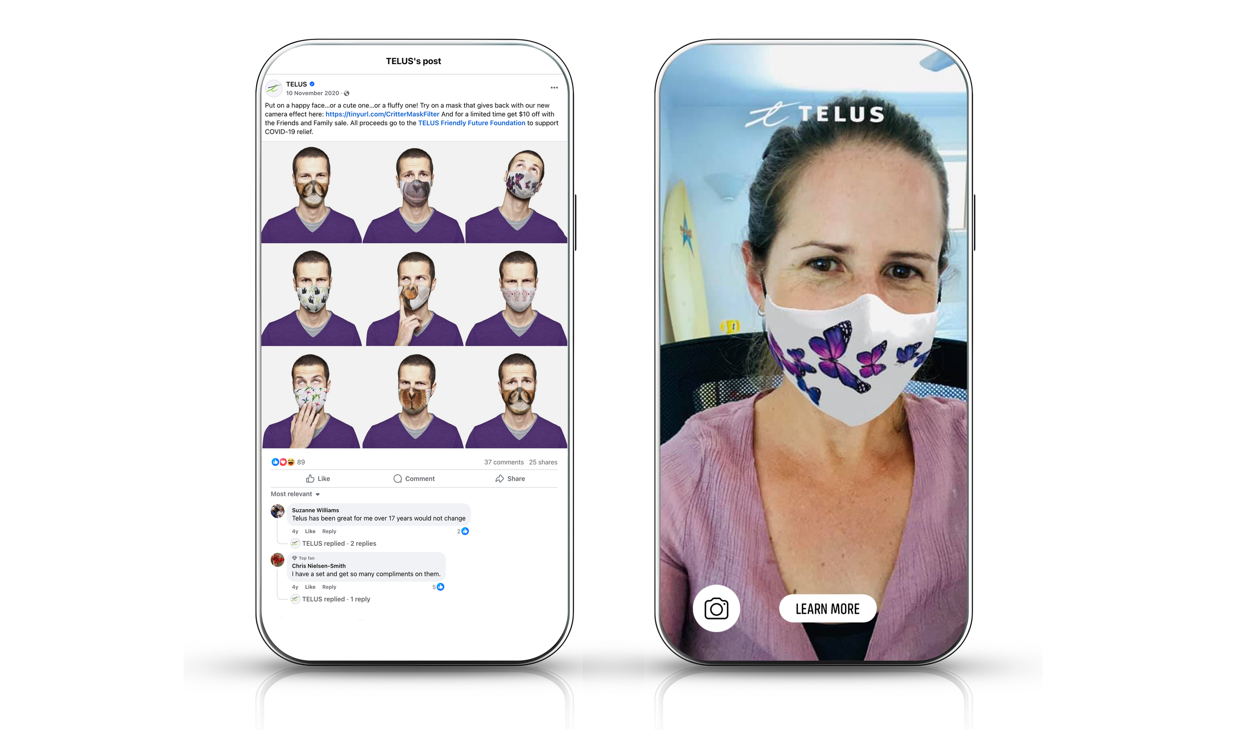 Put on a happy face…or a cute one…or a fluffy one! We launched unique critter masks in support of the TELUS Friendly Future Foundation. Proceeds from each mask went to the TELUS Friendly Future Foundation to support public healthcare efforts and COVID-19 relief efforts across Canada. We then made an augmented reality app to try on each mask to see which one suited you the most.